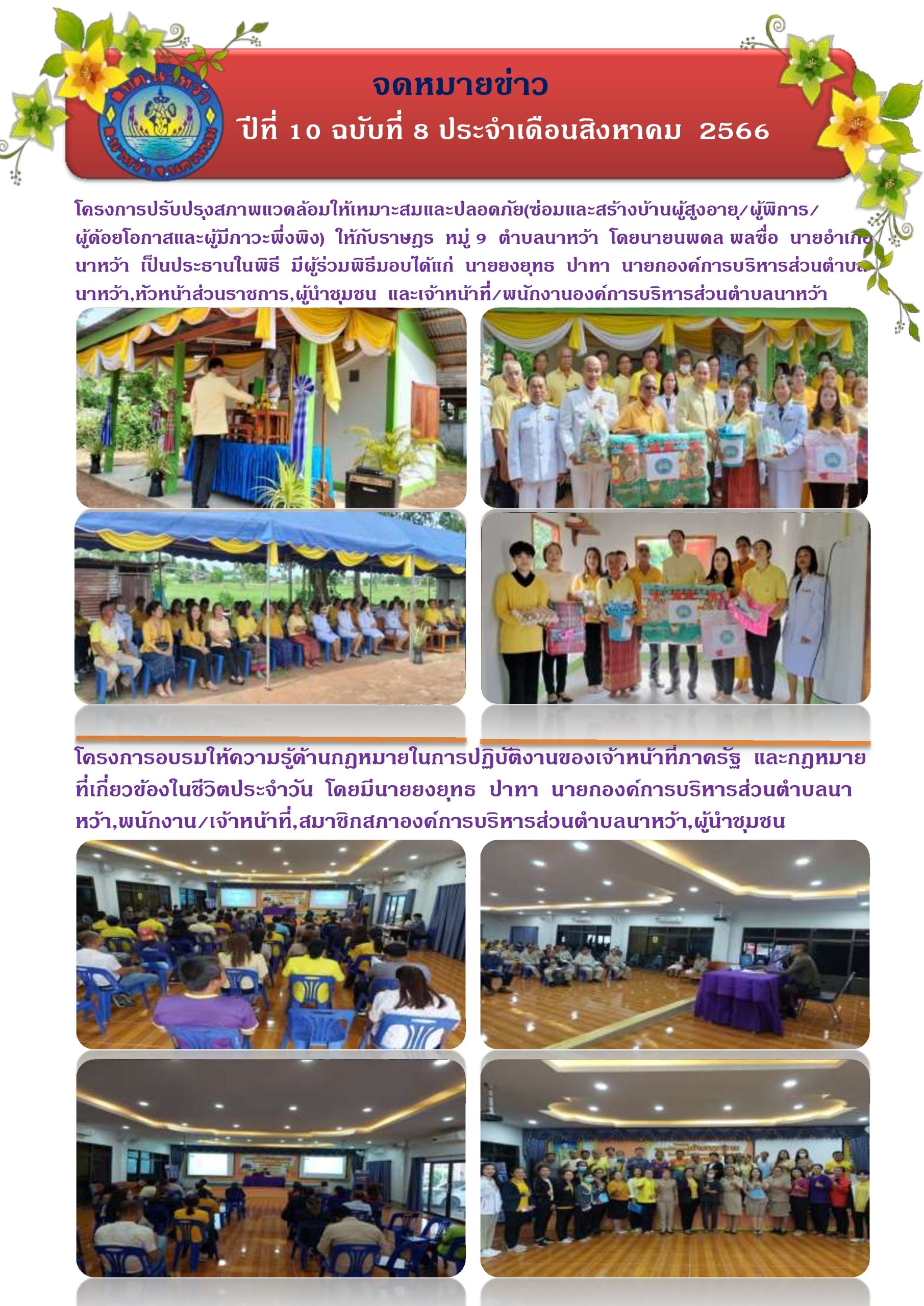 04-03-2569 ประชาสัมพันธ์แจ้งข่าวคุ้มครองผู้บริโภค 03-03-2569 ITA2569 27-02-2569 มอบบ้านโครงการปรับสภาพแวดล้อมและสิ่งอำนวยความสะดวกของผู้สูงอายุให้เหมาะสมและปลอดภัย ปี พ.ศ. 2569 หลังที่ 1 และหลังที่ 2 27-02-2569 ประชาสัมพันธ์จดหมายข่าวประจำเดือนกุมภาพันธ์ 2569 27-02-2569 ประชุมสมัยสามัญ 1/2569 ครั้งที่ 2 วันที่ 27 กุมภาพันธ์ 2569 ณ ห้องประชุมสภาองค์การบริหารส่วนตำบลนาหว้า